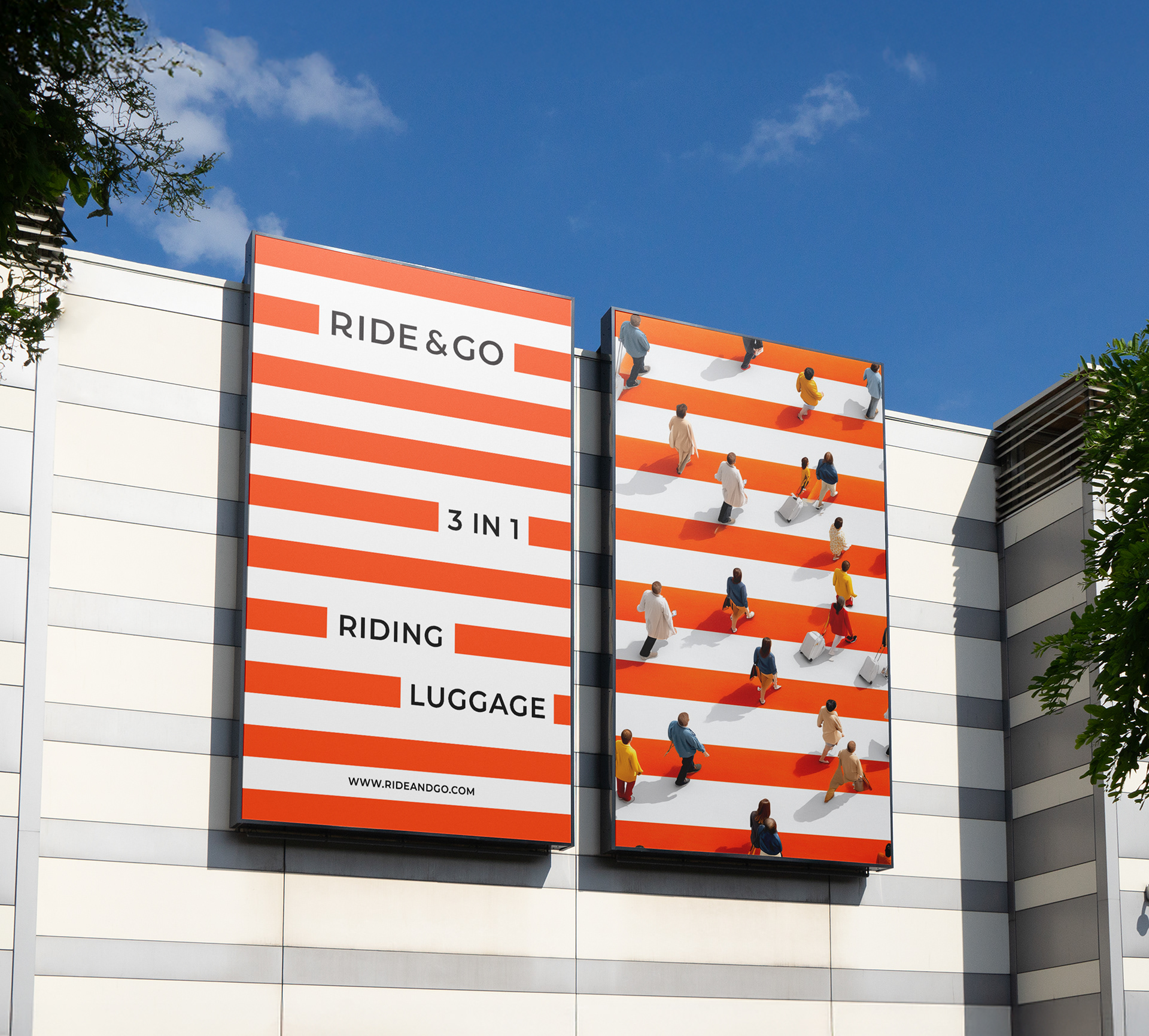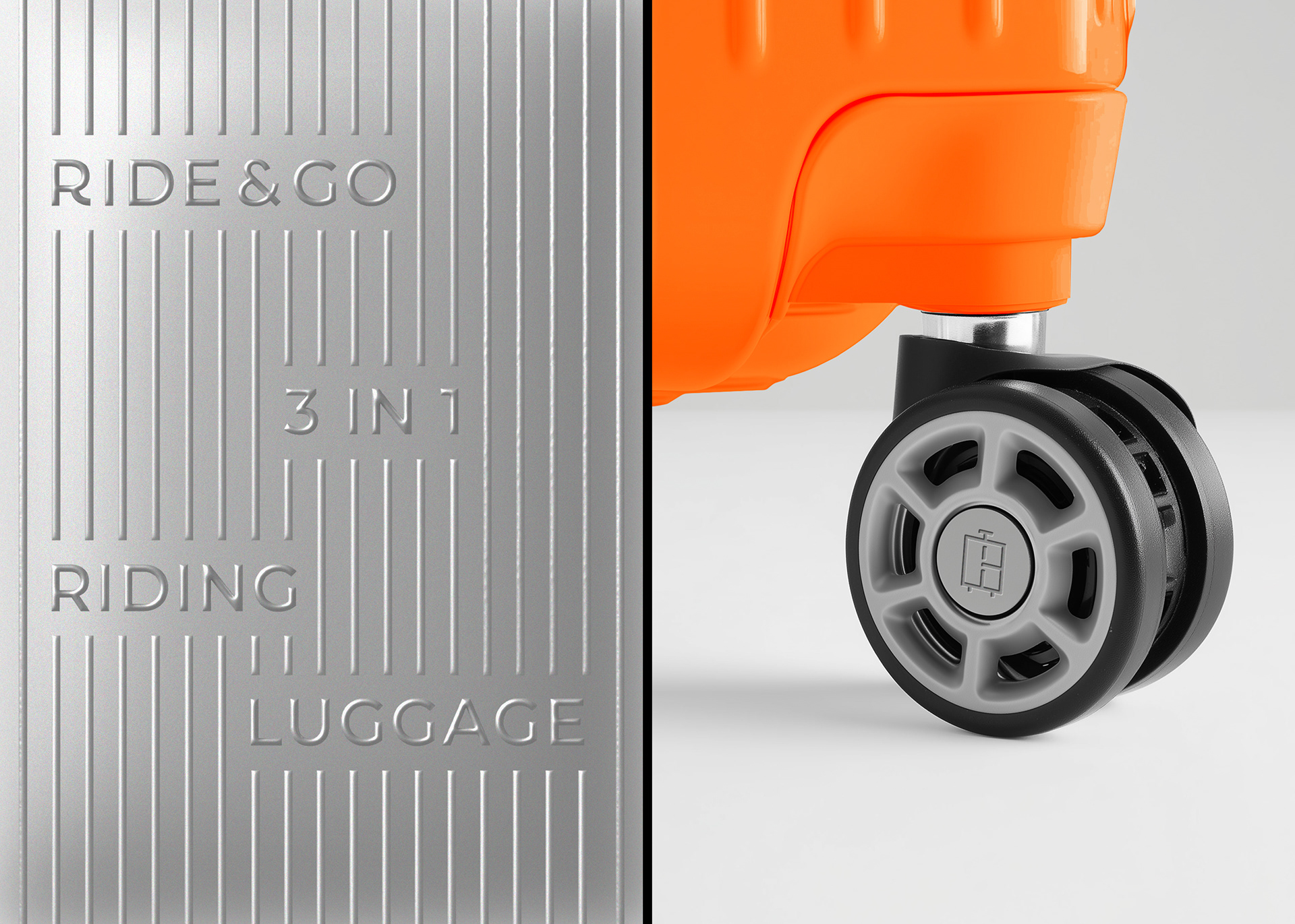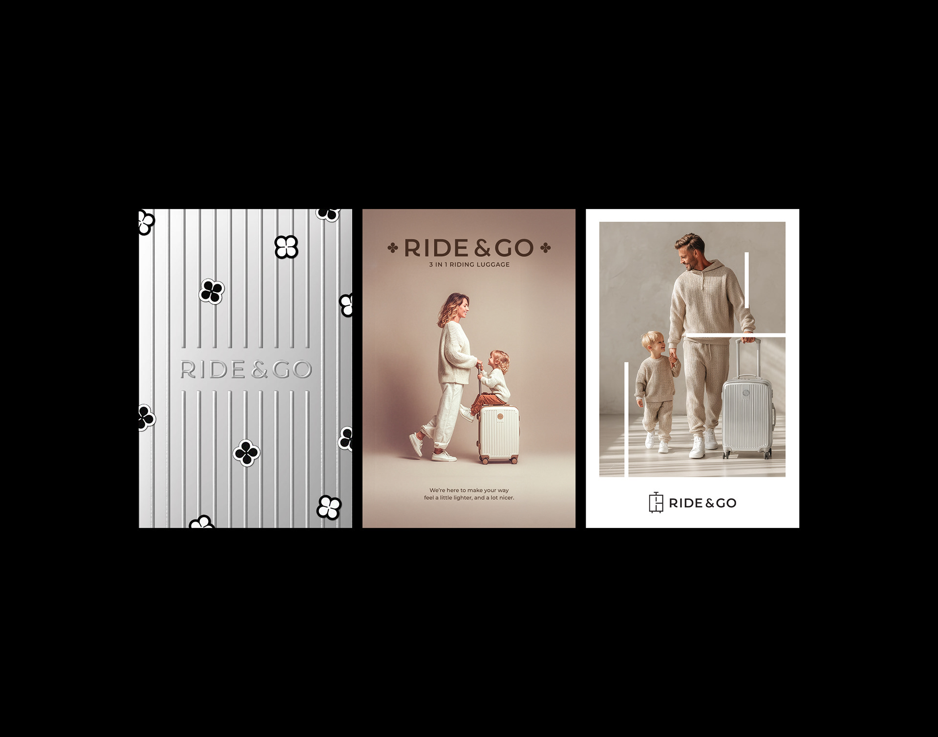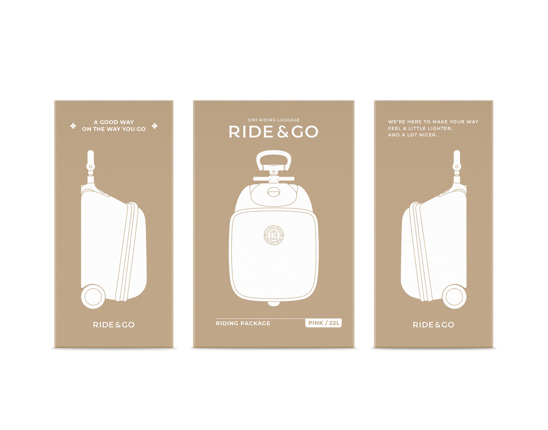 Ride&Go는 짐을 담는 캐리어이자 아이가 직접 탈 수 있는 이동 수단, 간이 의자의 기능을 겸한 3 in 1 라이딩 캐리어 브랜드로, 아이와 함께하는 여행을 보다 편안하게 만드는 브랜드의 목표가 자연스럽게 전달될 수 있도록 디자인 방향을 설정했습니다.