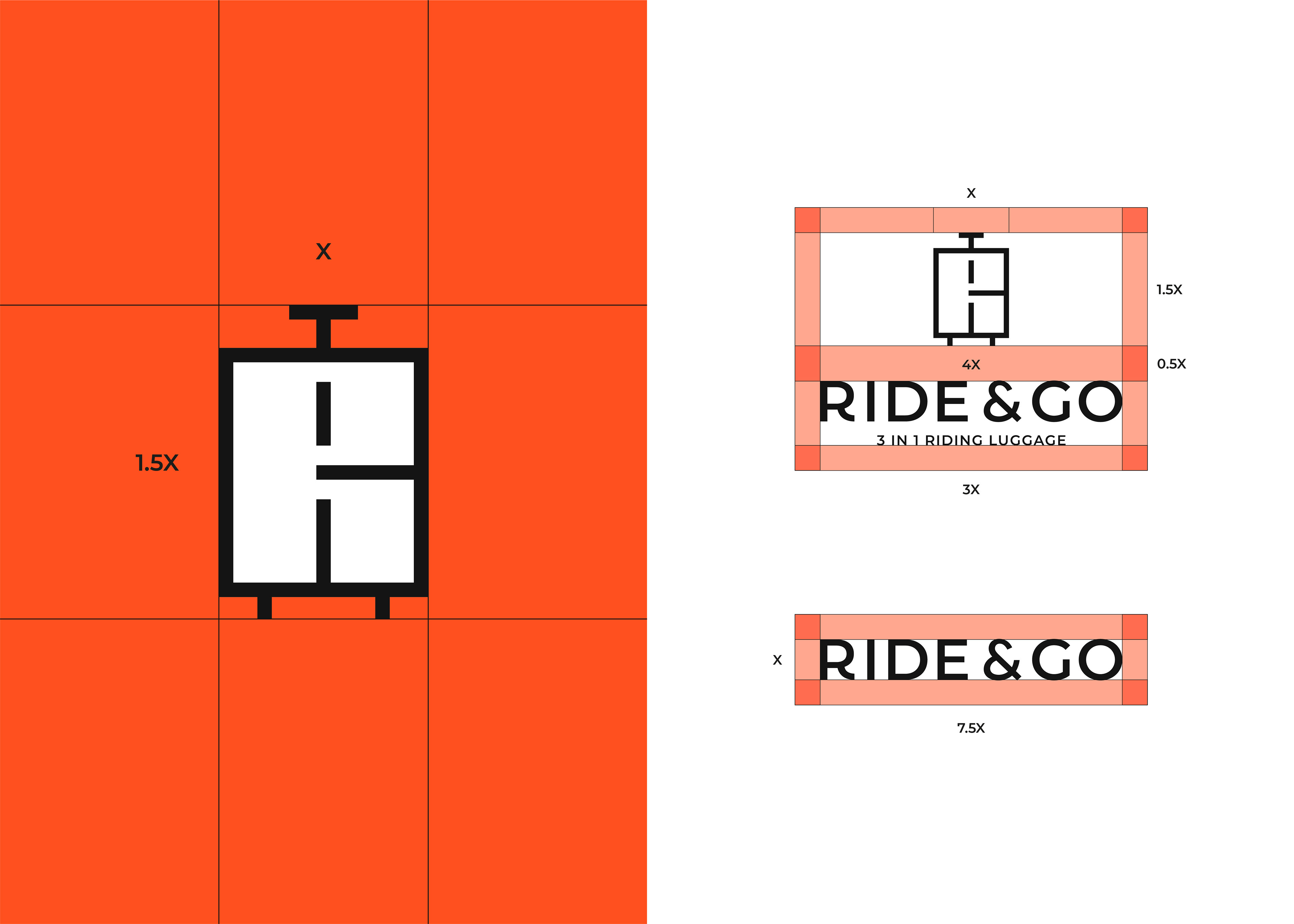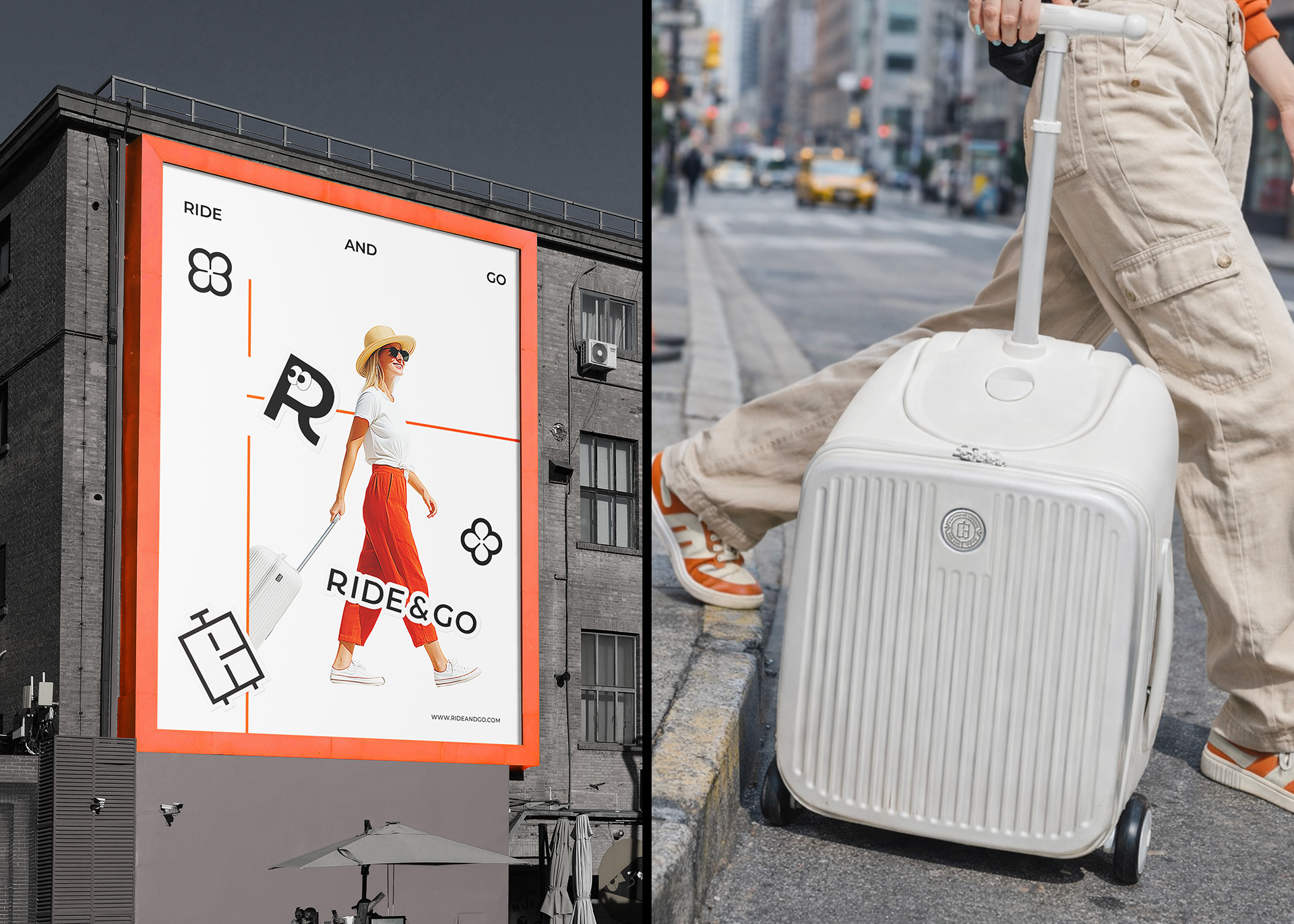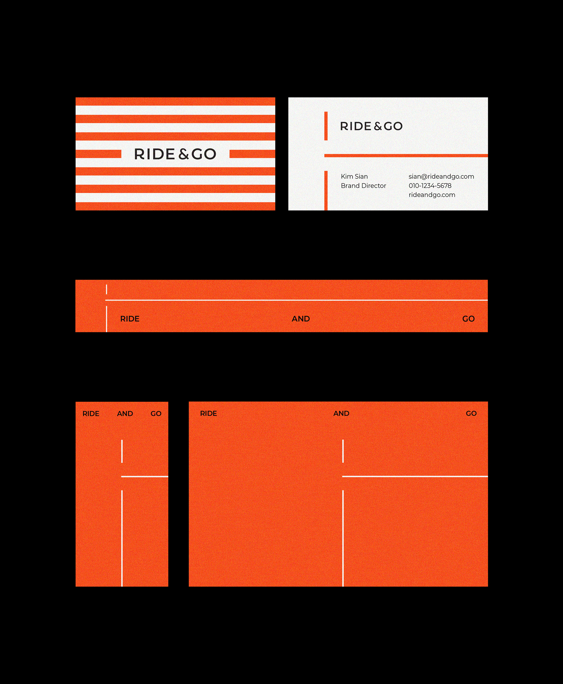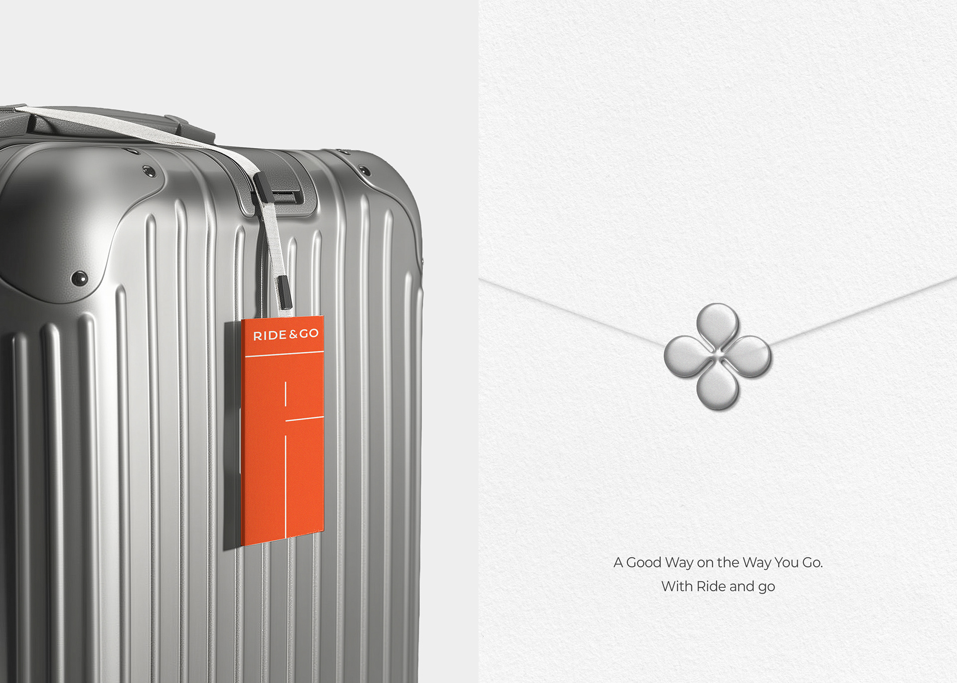 Ride&Go의 로고 심볼은 대표 이니셜 R에 캐리어의 형태를 결합해, 브랜드의 기능적 정체성을 직관적으로 표현했습니다. 로고타입에서는 여행을 떠나는 가벼운 발걸음을 형상화해 Ride&Go의 경쾌하고 친근한 이미지를 표현했습니다.