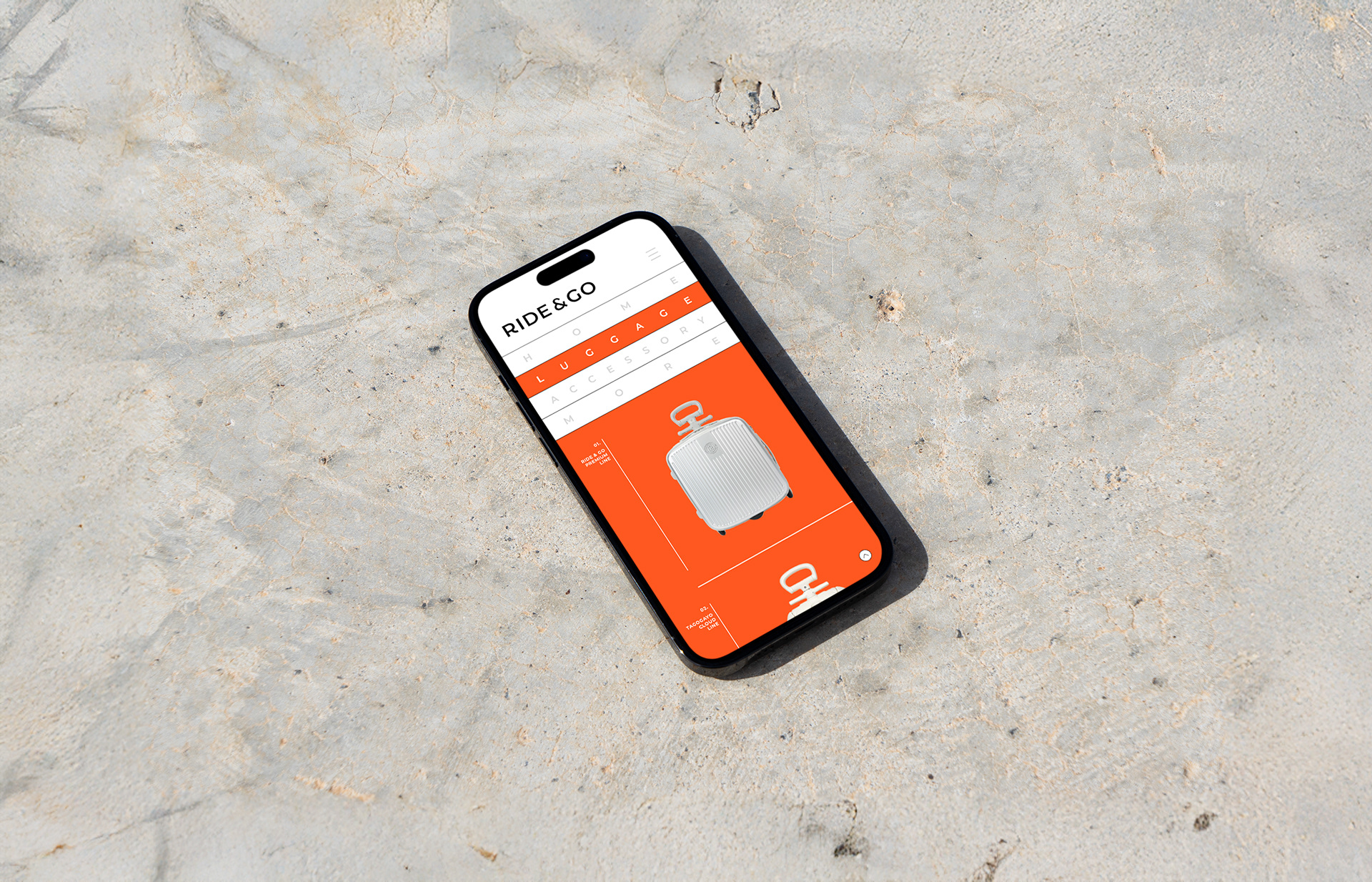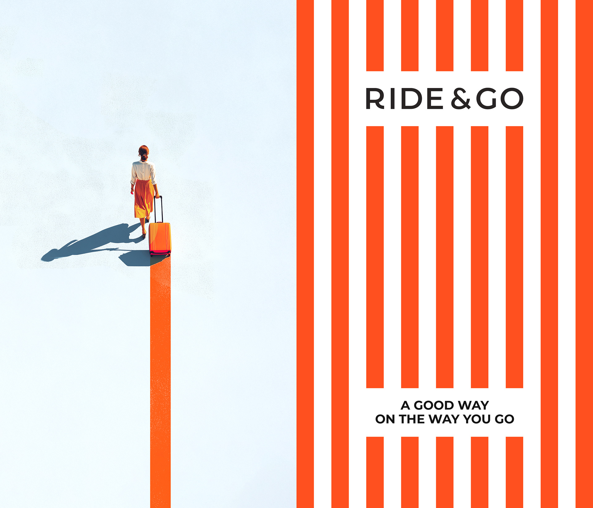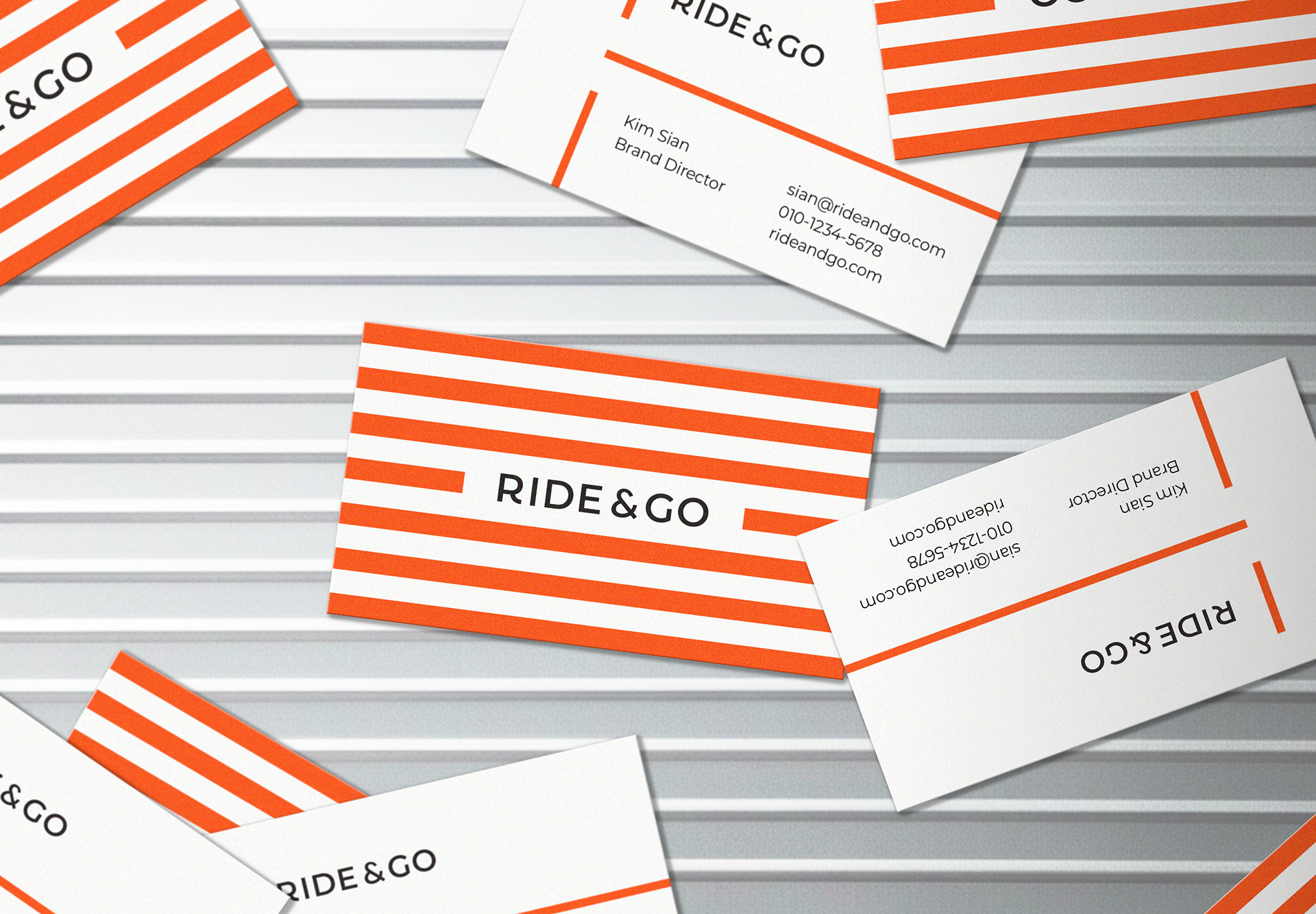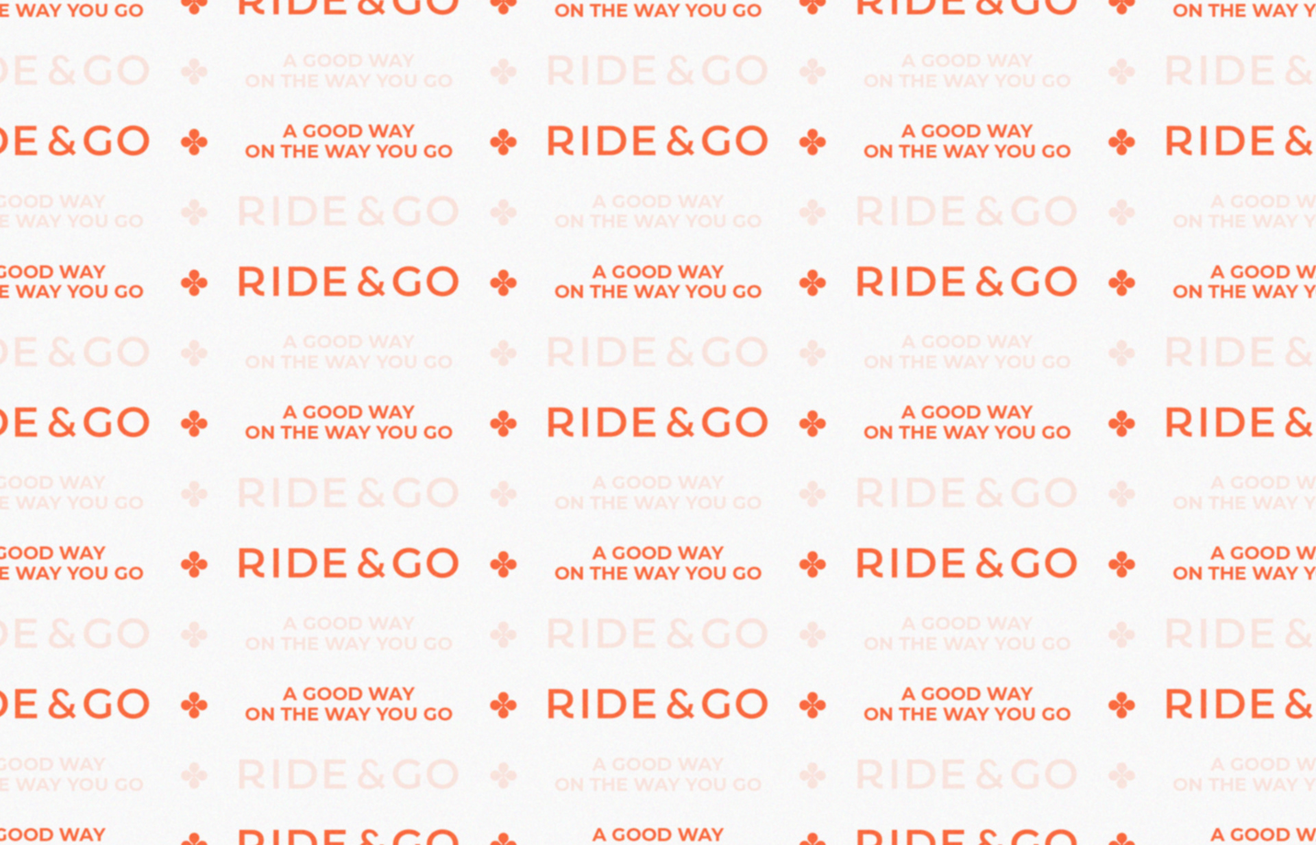 Ride&Go의 로고 심볼은 대표 이니셜 R에 캐리어의 형태를 결합해, 브랜드의 기능적 정체성을 직관적으로 표현했습니다. 로고타입에서는 여행을 떠나는 가벼운 발걸음을 형상화해 Ride&Go의 경쾌하고 친근한 이미지를 표현했습니다.